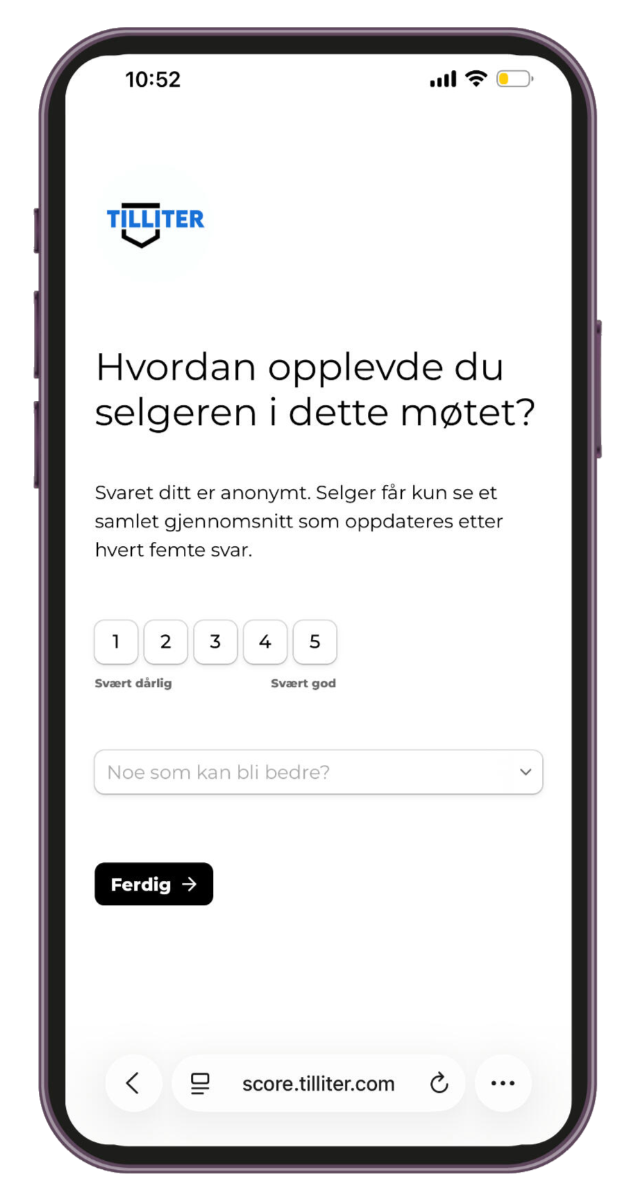 Etter at fem kunder har svart får du en mail med din gjennomsnittlige score og hva kundene mener kan bli bedre.